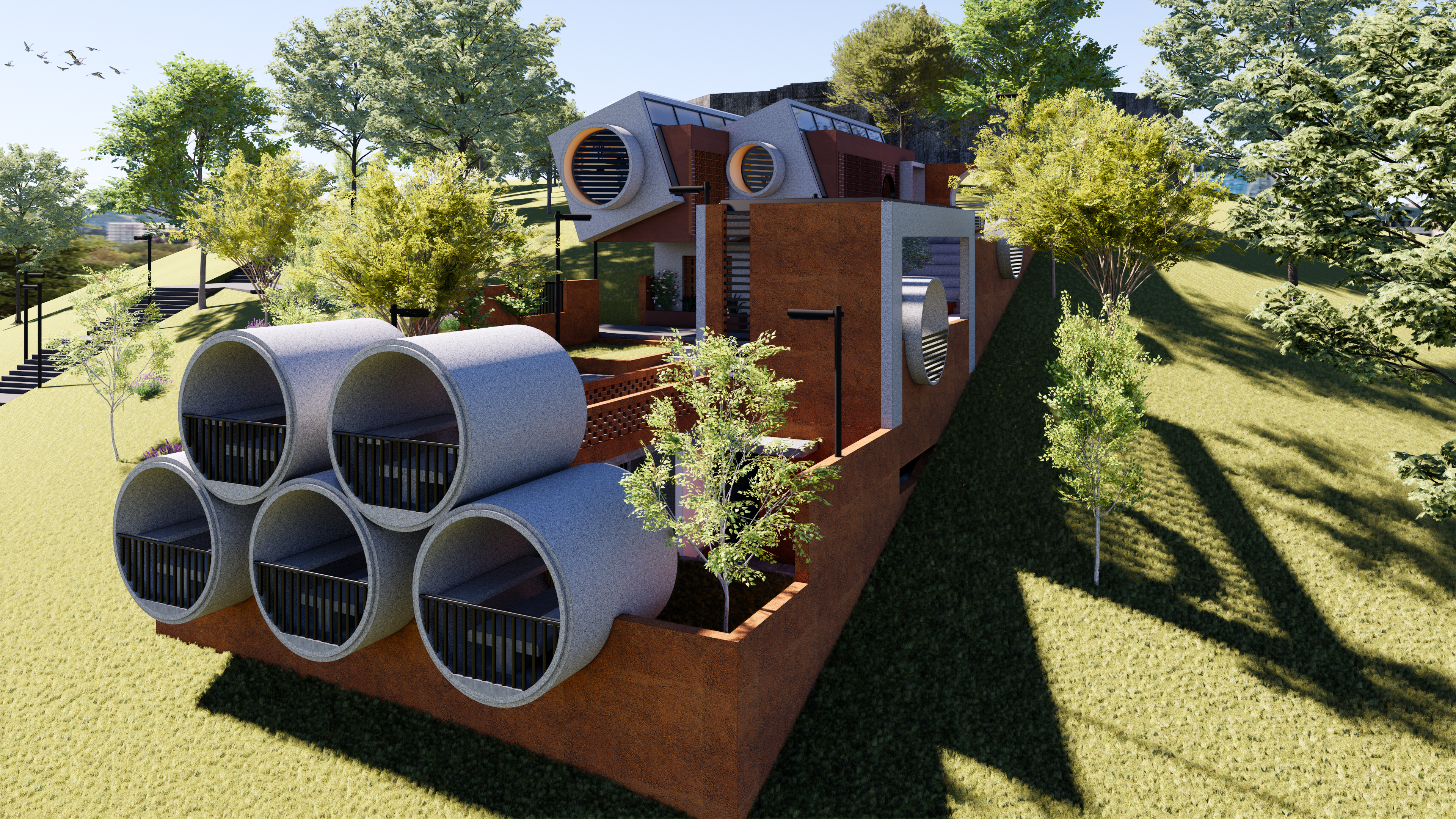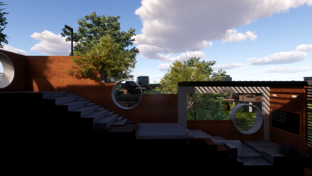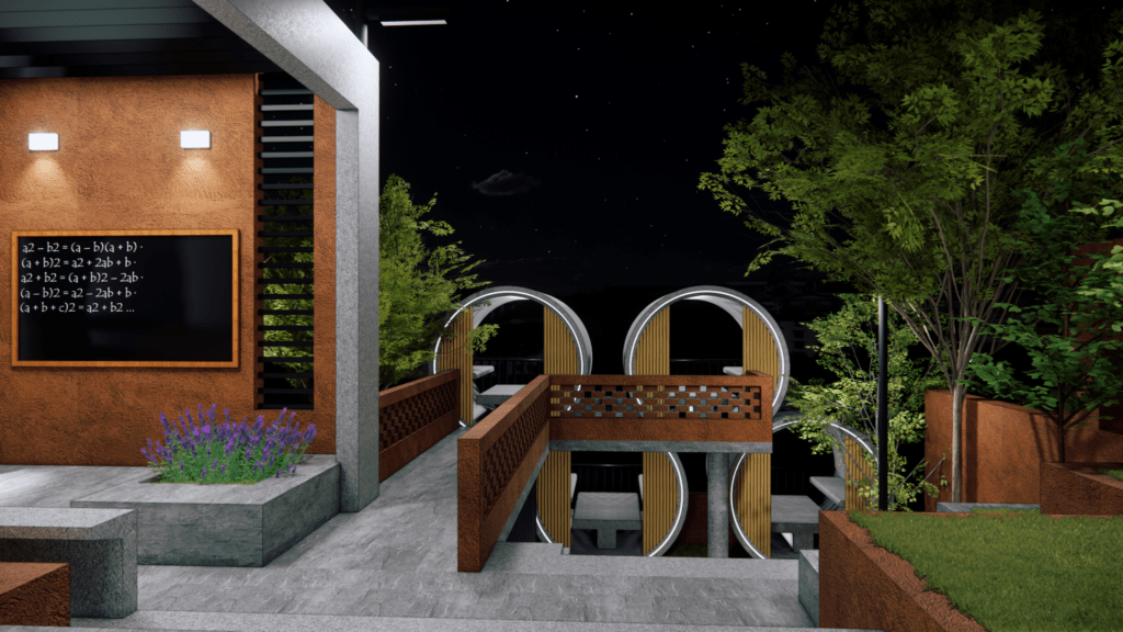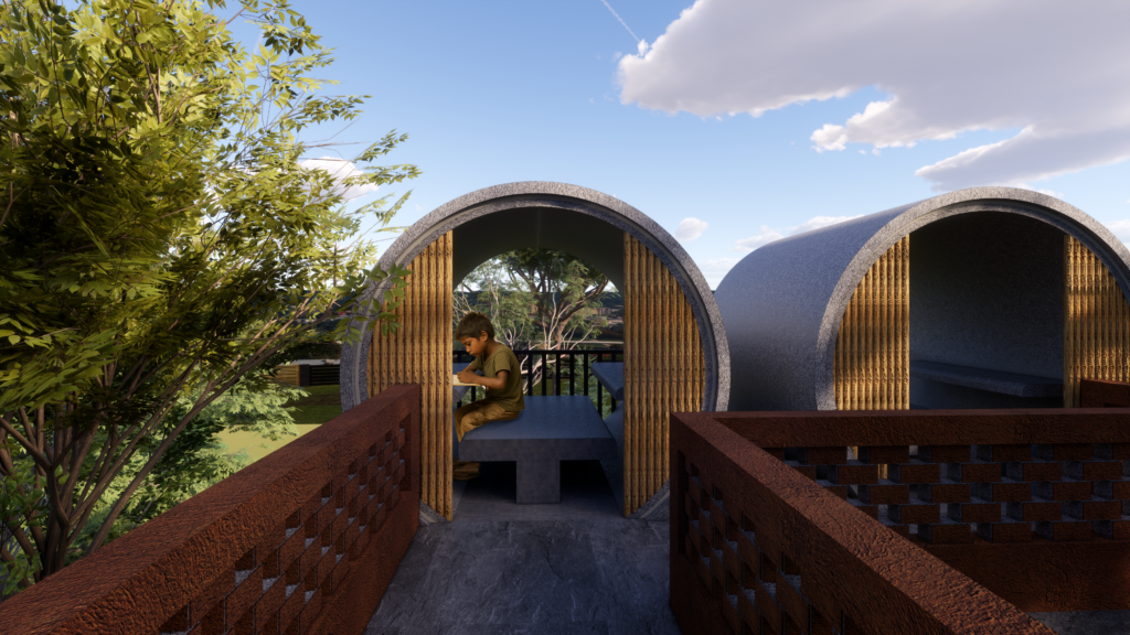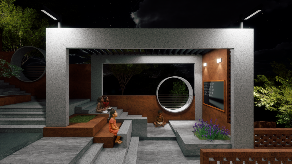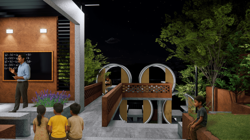 The study space for underprivileged children, designed as a modern Gurukul, is a transformative sanctuary tailored for young learners. Inspired by ancient Indian Gurukul traditions, it blends timeless principles with innovative design. The space features modular, cylindrical learning pods made from sustainable materials, fostering an interactive and inclusive environment. Open courtyards and natural light enhance the serene atmosphere, while flexible layouts support group study, individual reflection, and creative exploration. Equipped with essential resources like chalkboards and seating, the design prioritizes accessibility and durability, ensuring a nurturing space where children can connect with their roots, build confidence, and envision a brighter future.