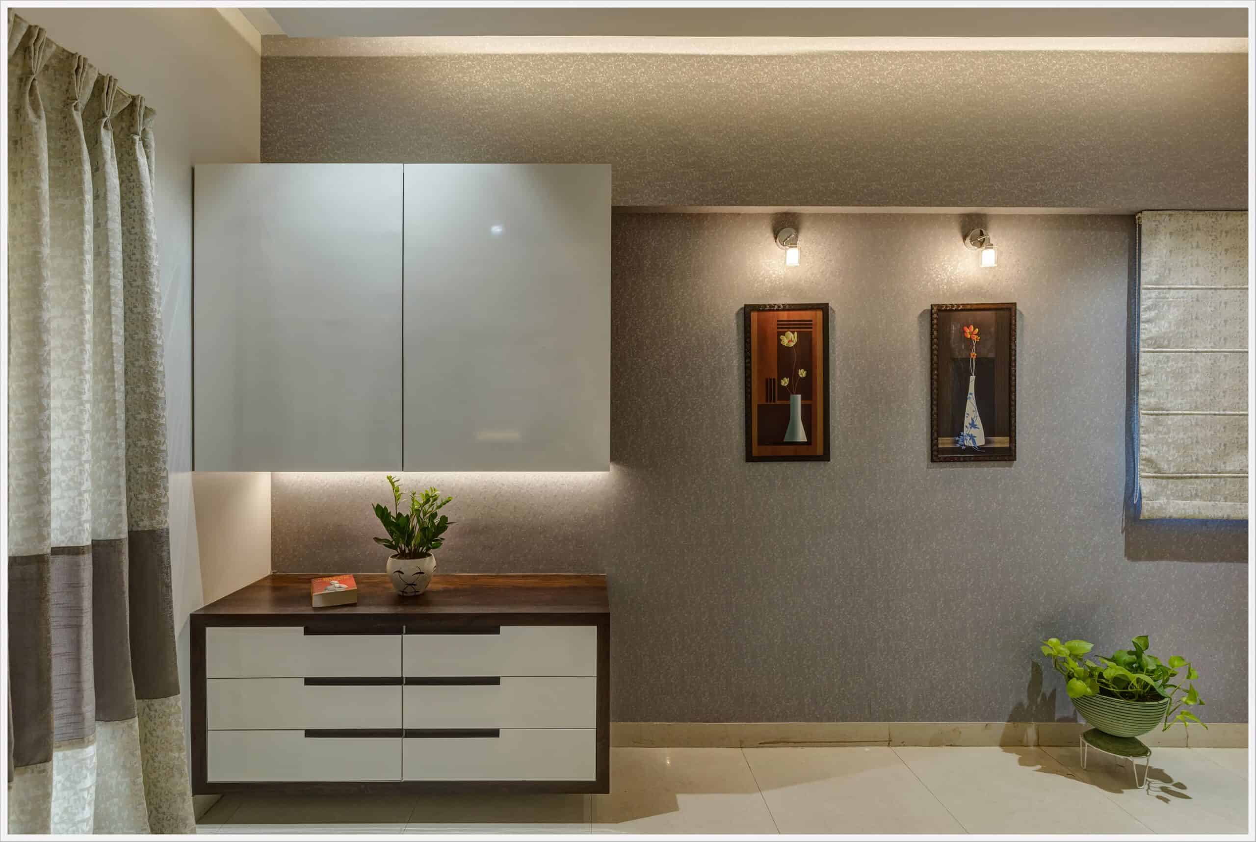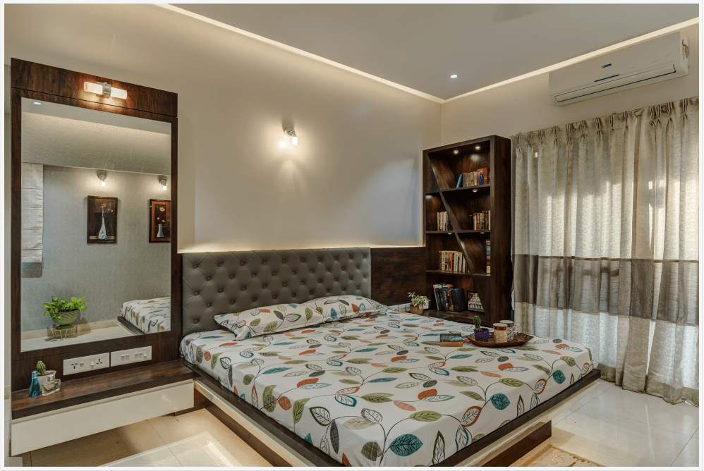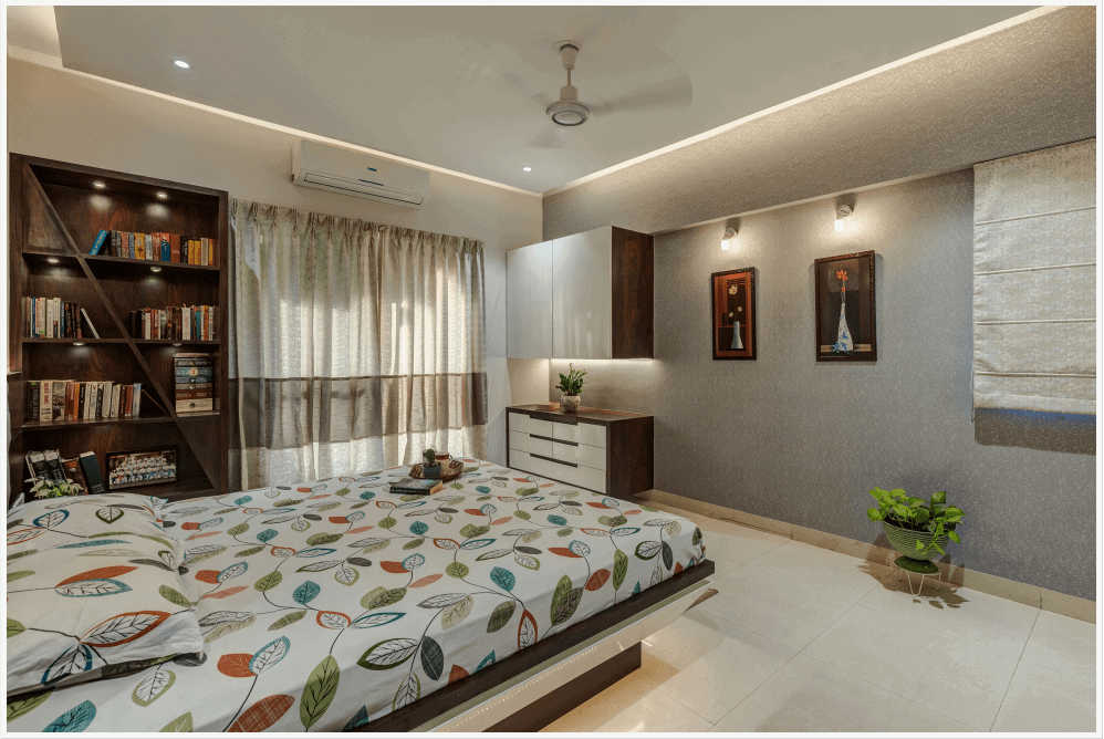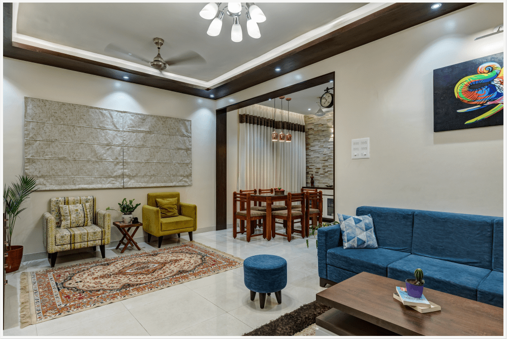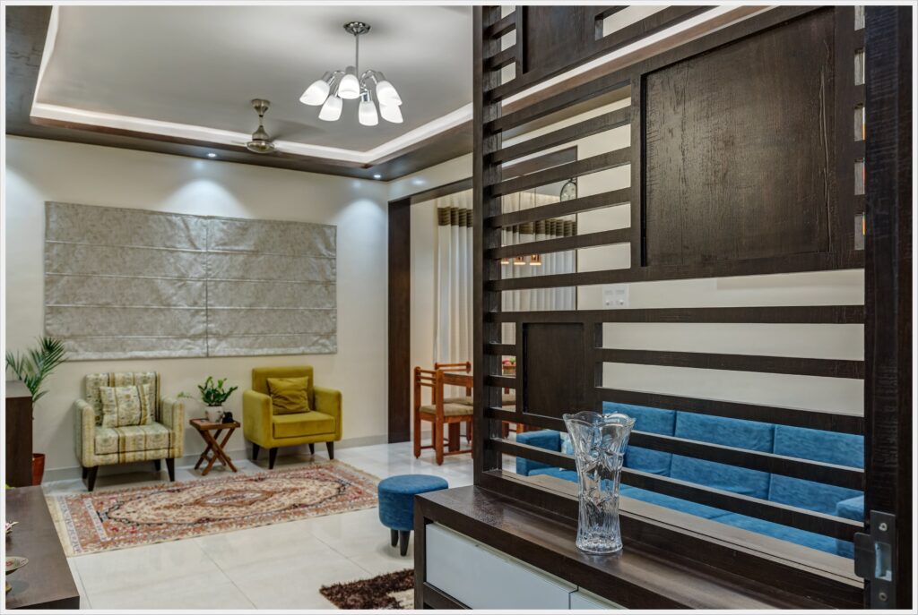 1500 sqft Apartment interior in Roystonia, Magarpatta city was designed for a Doctor couple and their family who preferred dark wooden shades in their furniture. Our challenge was to balance the natural light conditions with the dark wooden shade making the rooms look spacious and welcoming.