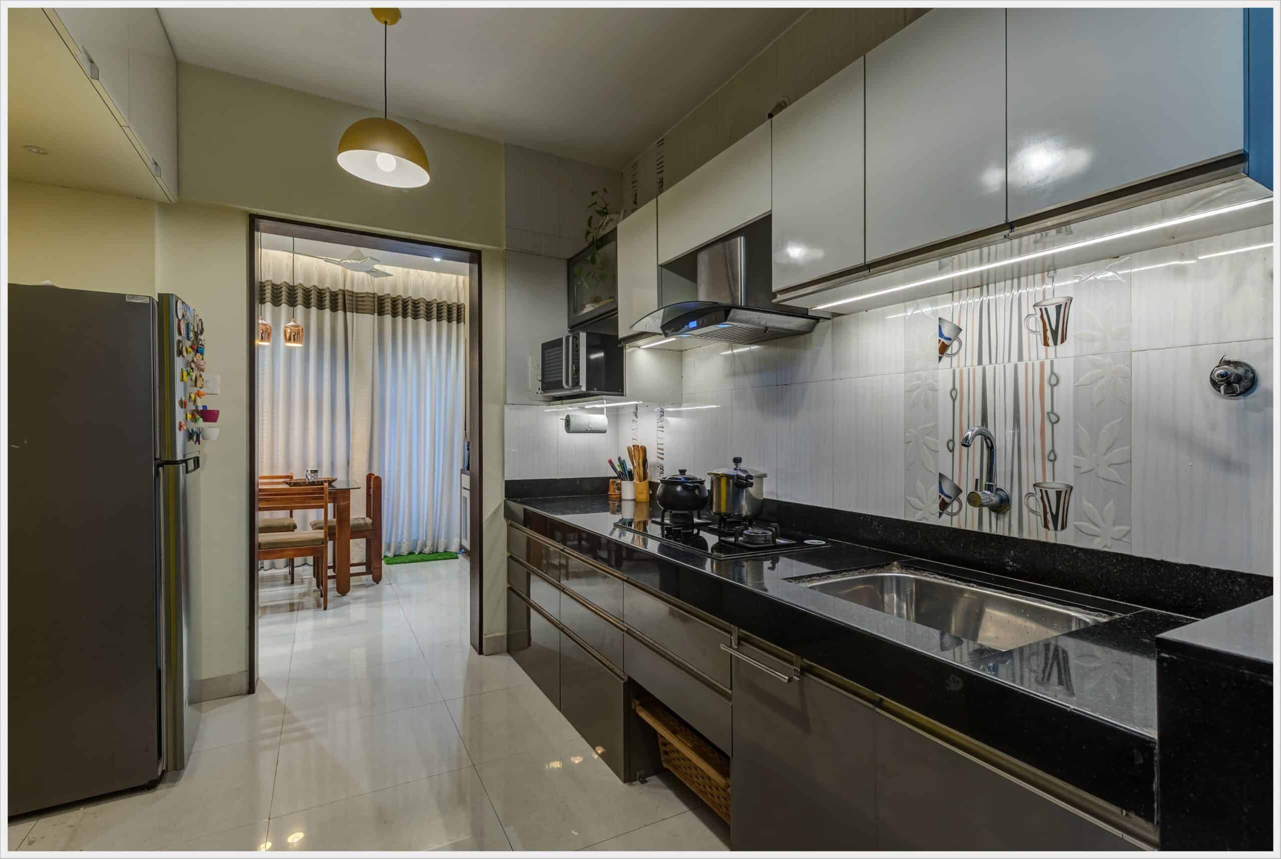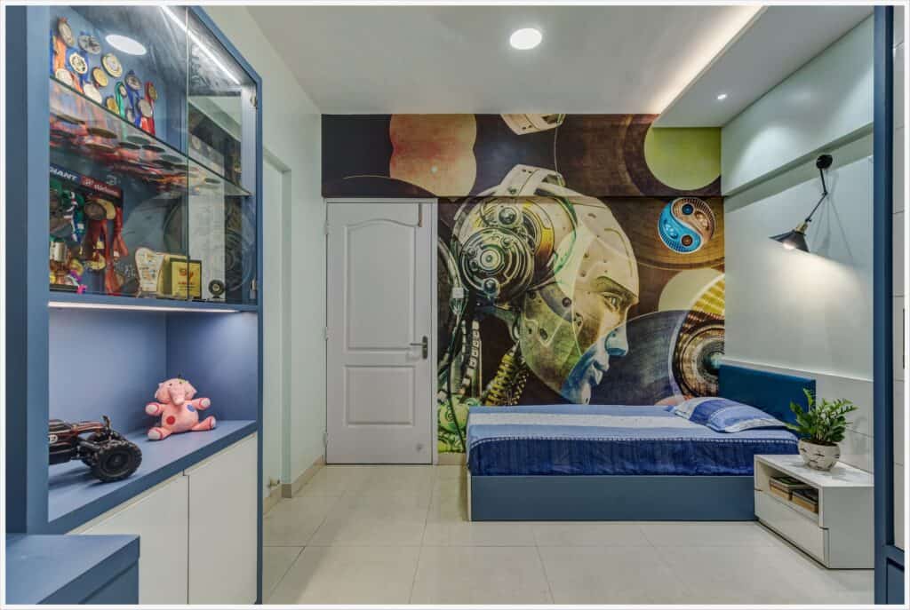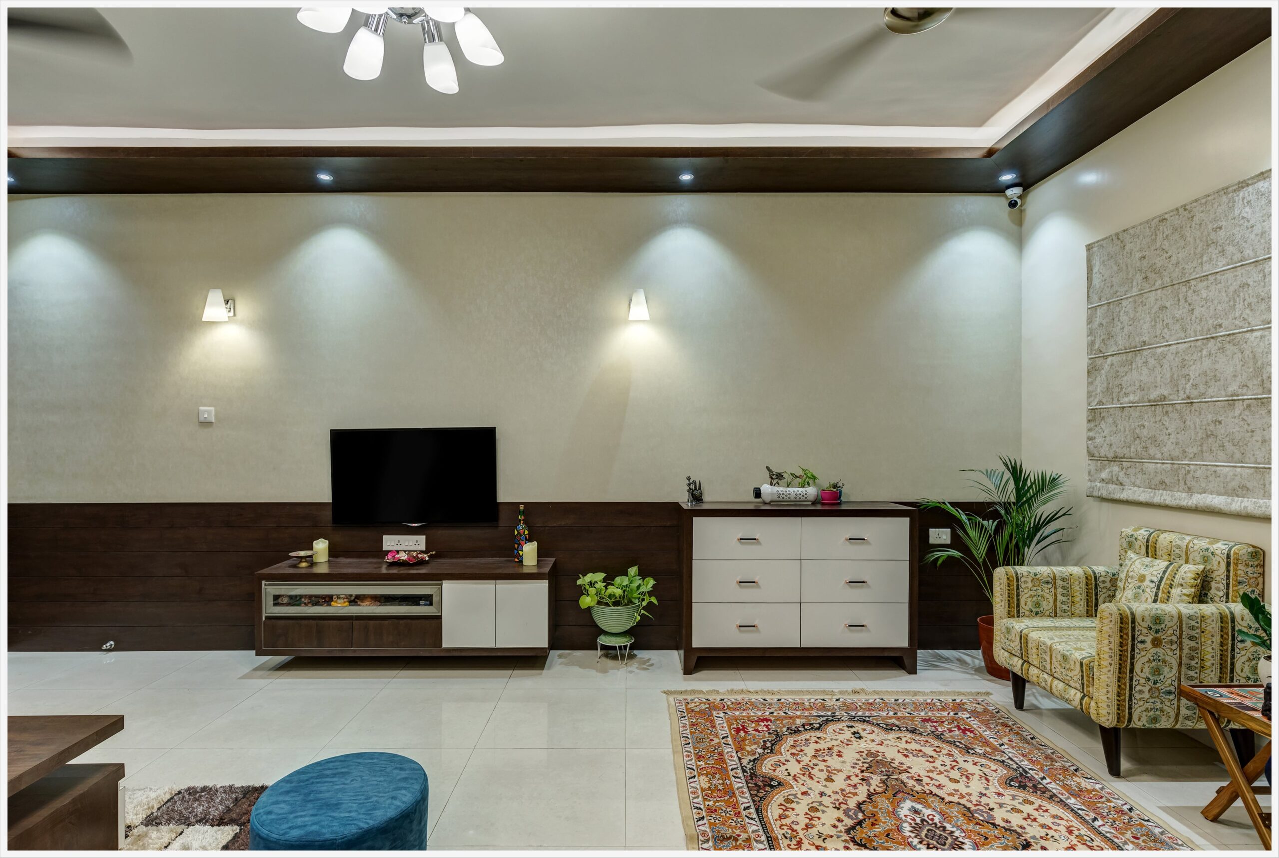 1500 sqft Apartment interior in Roystonia, Magarpatta city was designed for a Doctor couple and their family who preferred dark wooden shades in their furniture. Our challenge was to balance the natural light conditions with the dark wooden shade making the rooms look spacious and welcoming.